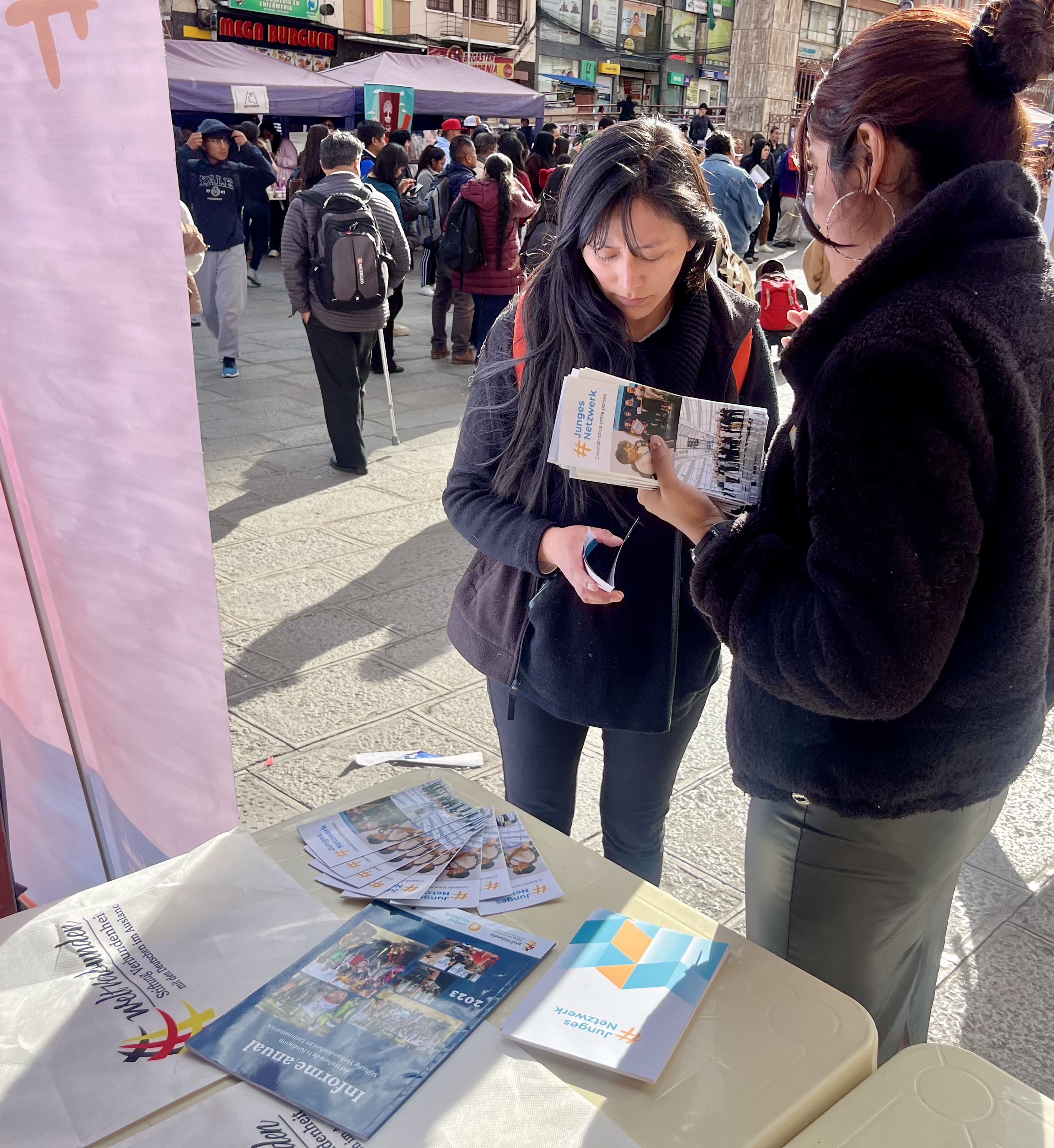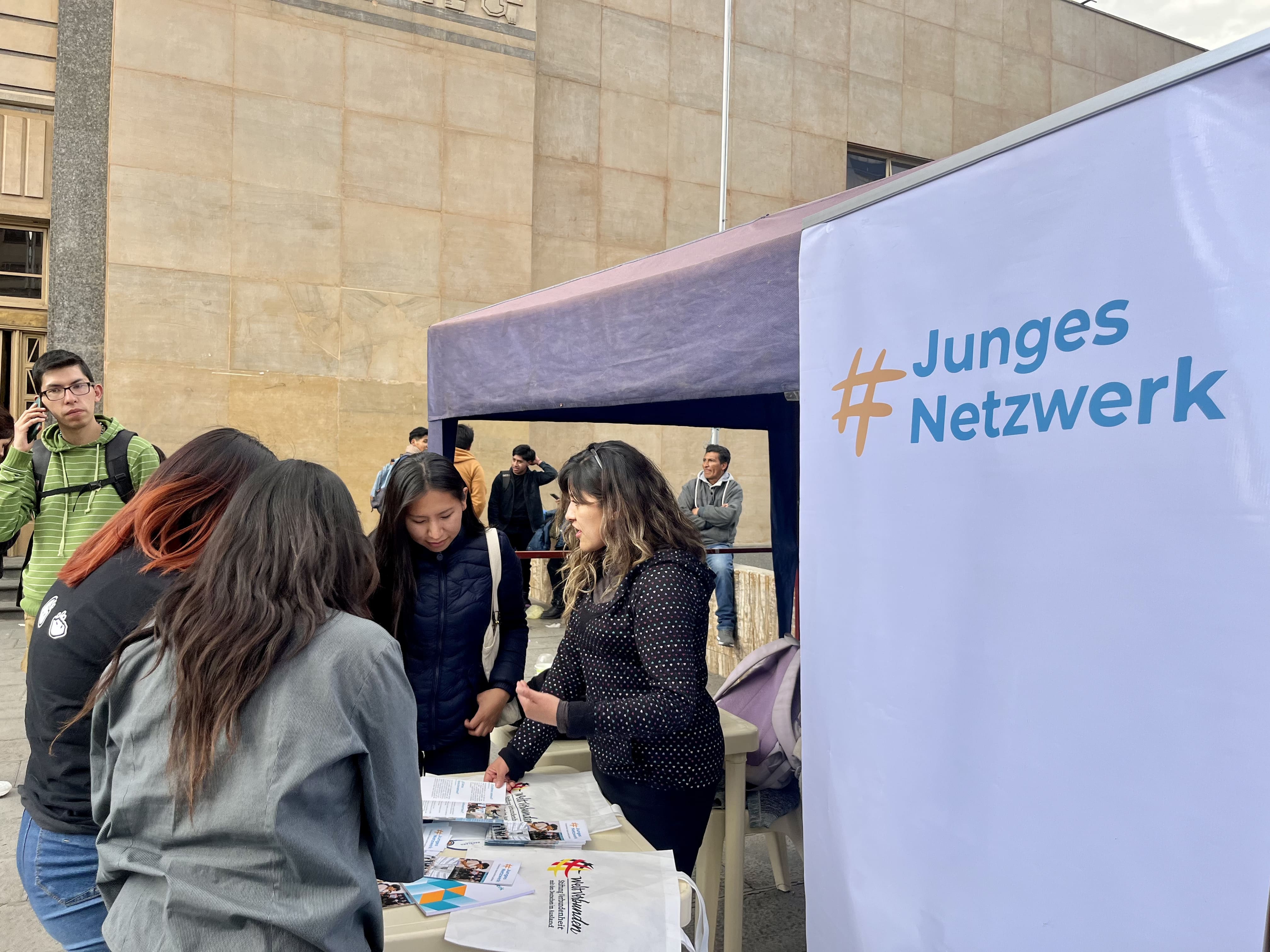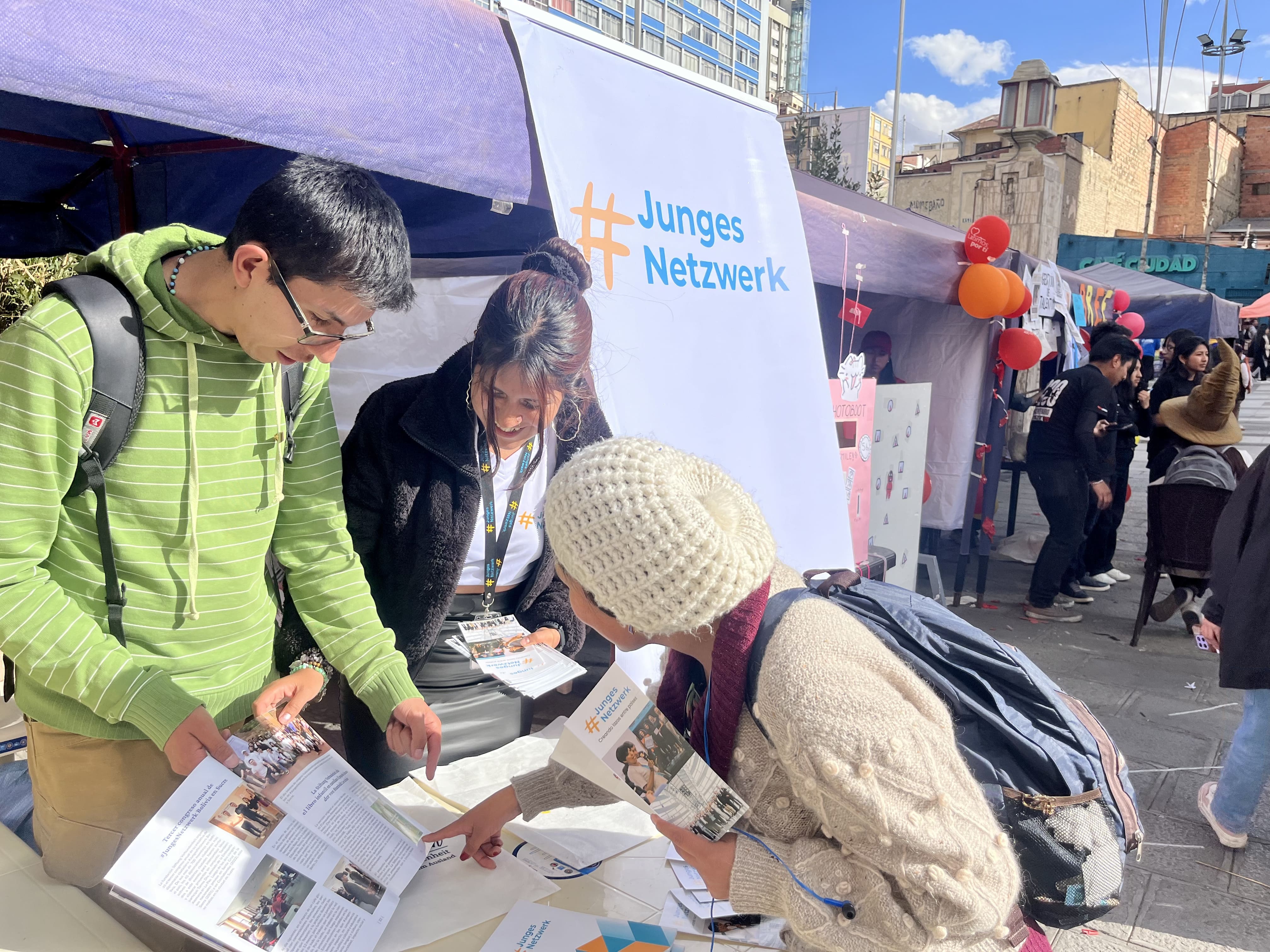 La actividad reunió a diversas organizaciones sin fines de lucro con el propósito de dar a conocer el trabajo que desarrollan en la región. En este marco, los representantes de la red presentaron las iniciativas de #JungesNetzwerk en Bolivia mediante material didáctico, lo que generó gran interés entre estudiantes y público asistente en integrarse a la Red de Diplomacia Ciudadana Latino-Alemana.